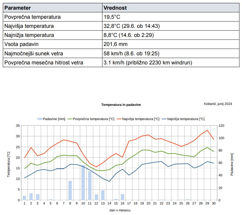 Junij je bil precej povprečen mesec. Med 10. in 16.6. je bilo nestabilno obdobje s pogostimi plohami, vendar padavin ni bilo veliko. V mesecu se je nad 30°C ogrelo v 4 dneh, tropskih noči ni bilo.